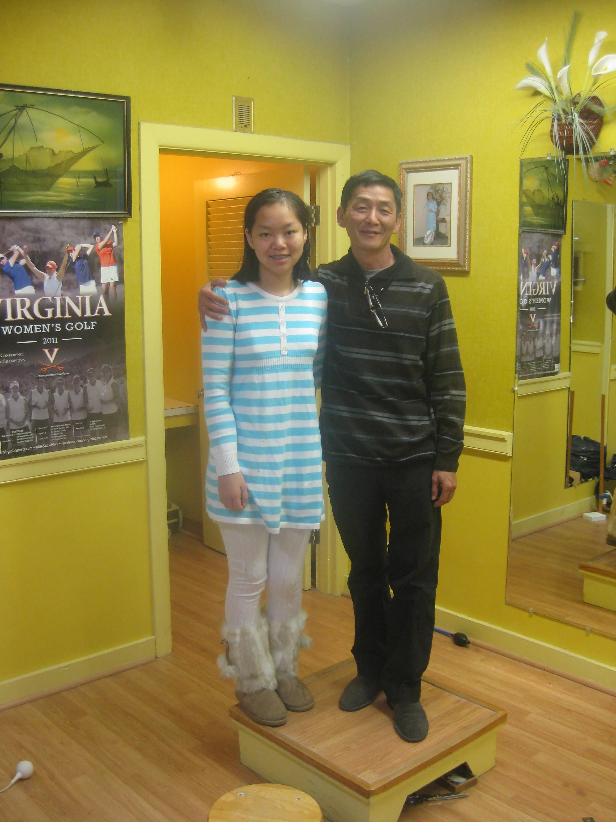 Once the two women have indulged in their moment of vanity, the reality of their current surroundings sets it. The low ceilings of the workshop can barely hold the warmth emanating from the yellow walls covered with posters of the UVA golf team who have also taken their turn on these platforms. Vietnamese travel posters hint at the origins of the shop’s owners who quietly look on from the corner.