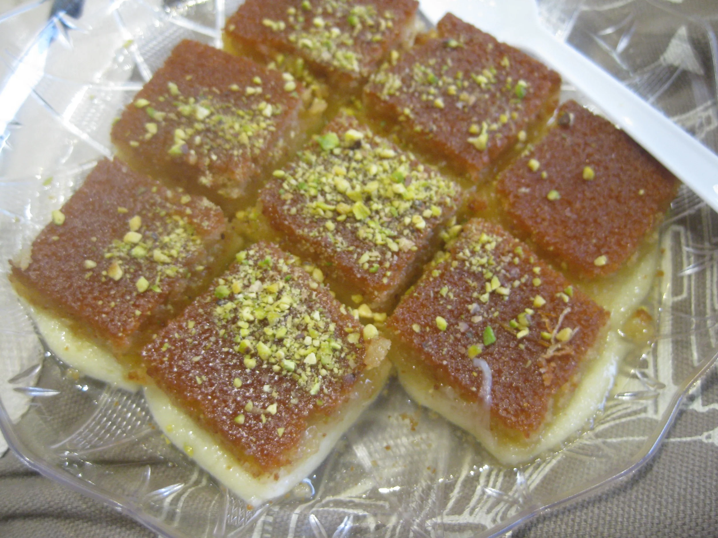 The color denotes that this is kunafa nabulseeya, that is, kunafa from Nablus, Palestine. Something like an inverted pie, the unifying feature of kunafa, in its many expressions, is the contrast between its two layers. Mahmoud points out that Arab sweets are all about balance between contrasting textures and flavors. The top layer of kunafa is a crust of either a fine semolina or a thin noodle like pastry, which confusingly is also known as kunafa, or both. The bottom layer is either a mild cheese or cream. Served warm with a dusting of pistachios and drizzle of syrup, the creamy layer softens and stretches beneath the crisp shell.
