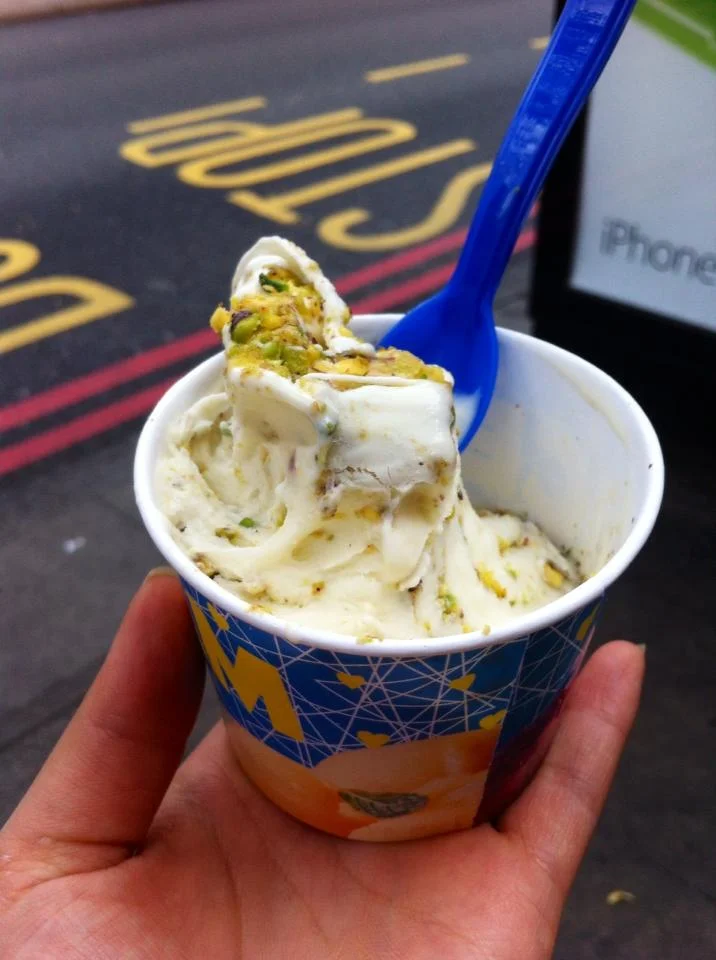 When read about a place in London that was making booza al-haleb, a Syrian pistachio ice milk, I knew how I would be spending my afternoon. But when I got to Diwan Damas it seemed that my culinary quest for this treat, so rarely found outside of the Middle East, might have been in vain. Aside from a shocking neon blue bubblegum flavor, the ice cream freezer outside the shop was filled with chocolate, hazelnut, vanilla, and other familiar flavors. I tried to not look too disappointed as the shopkeeper bounded forward, eager to serve me. When I inquired about the mythical booza al-haleb, he smiled and pulled out what looked like a white Swiss roll studded with pistachios from behind the counter. He explained that whereas ice cream is made by whipping air into a custard base, booza al-haleb is made by kneading the air out of frozen milk that has been thickened with mastic gum, the resin of an evergreen shrub, and sahlep, the powdered root of the orchid. They form this stretchy mixture into thick slab, cover it in the most flavorful Iranian pistachios, and roll it up. I watched as he sliced one end off, gave it a twist and popped it in a cup. “This is the only place in Europe where you will find booza al-haleb.” Without the air it melts very slowly, giving me ample time to check out the other wonders of Diwan Damas with Mahmoud* as my guide.