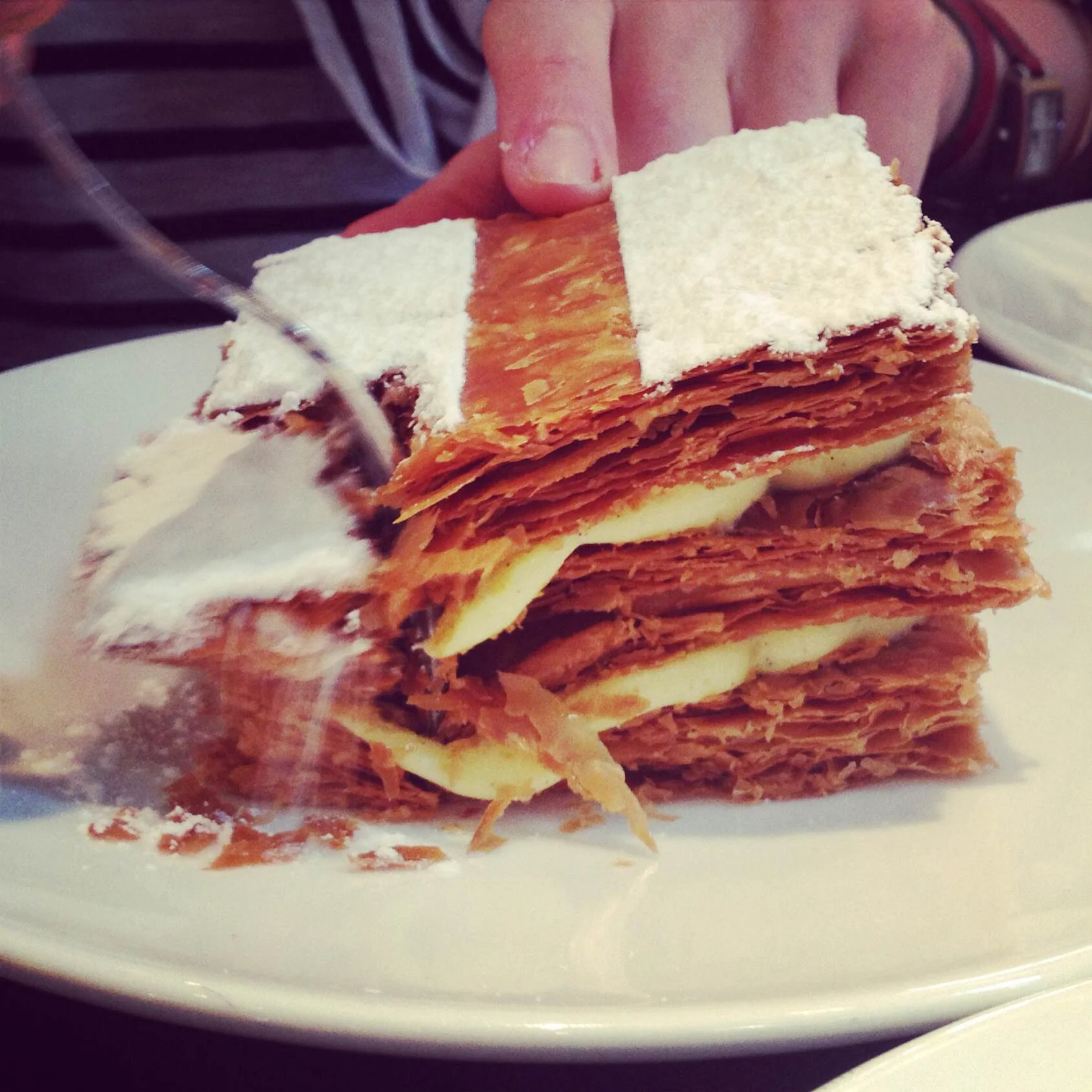 His pastries are not available to take away and one cannot even visually enjoy them as they do not sit in cases waiting to be consumed but rather are made to order. The millefeuille arrives at our table after being assembled in a workshop upstairs and carried down to the tea salon via a spiral staircase in the middle of the shop. This descent is the literal expression of a transcendental experience, a reminder that this is more than just food. Yes, the crispness of the puff pastry layered on the soft, just piped buttons of pastry cream means that with the application of your fork, the tower shatters—Catherine assures that me that “there is no elegant way to eat this”—and you taste the most marvelous contrast in flavors and textures. But even more than that, the entire ceremony around the preparation of the millefeuille makes you acutely aware of the moment and its intangibility.